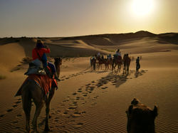 Io prenoto via mail il tour pomeridiano con Sahara Travels (di fronte al forte), che per 1200 rupie a testa ci porta con le jeep fino all’inizio del deserto, ci organizza il giro sui cammelli fino all’accampamento, dove viene servita la cena e ci riporta all’albergo. A Jaisalmer tutte le strutture organizzano lo stesso giro a prezzi simili, quindi non è necessario prenotare in anticipo. Esperienza carina, ma non entusiasmante.